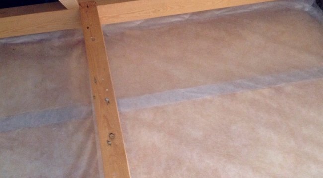 Этот способ широко используется мастерами и дает хороший результат. Для начала собирается потолок. Он должен быть прочным, чтобы выдержать достаточно большой вес утеплителя. Практика показывает, что лучший вариант в этом случае — доска-сороковка, уложенная поперек комнаты. Если того требуют размеры помещения, для усиления конструкции с внутренней стороны перпендикулярно укладываются доски-шестидесятки.